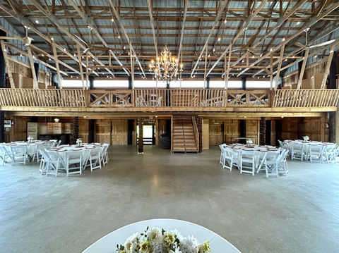 Our recently updated wedding barn can comfortably host up to 200 guests. It features a 40’x60’ enclosed area, a 15’x60’ upper-level loft, a 15’x60’ covered stable area, and a 30’x60’ attached pavilion. Elegant chandeliers and bistro lights hang from the rafters, creating a romantic atmosphere. The outdoor spaces around the barn provide perfect settings for an outdoor ceremony.